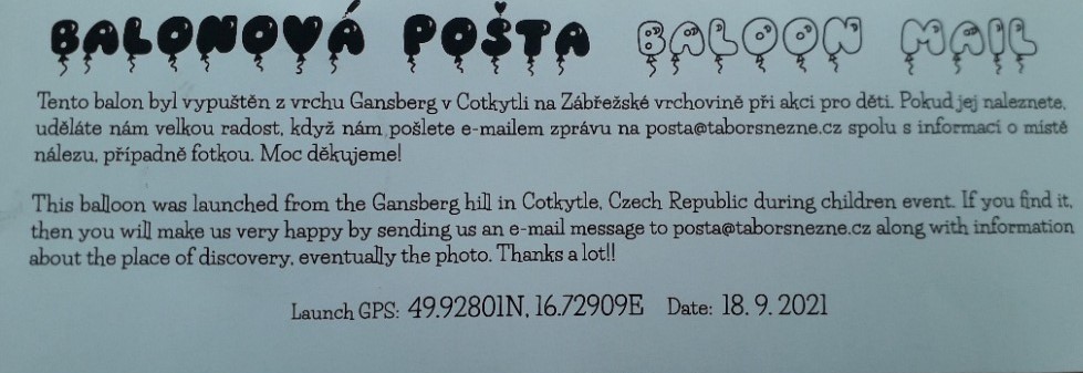 Dne 18.9.2021 se konala akce firmy Komfi, děti zde vypustily balónky v rámci zábavného odpoledne. Z obce Syrovín v okrese Hodonín přišla zpětná vazba. Balónek Máti - 7 let, uletěl trasu 107 km.