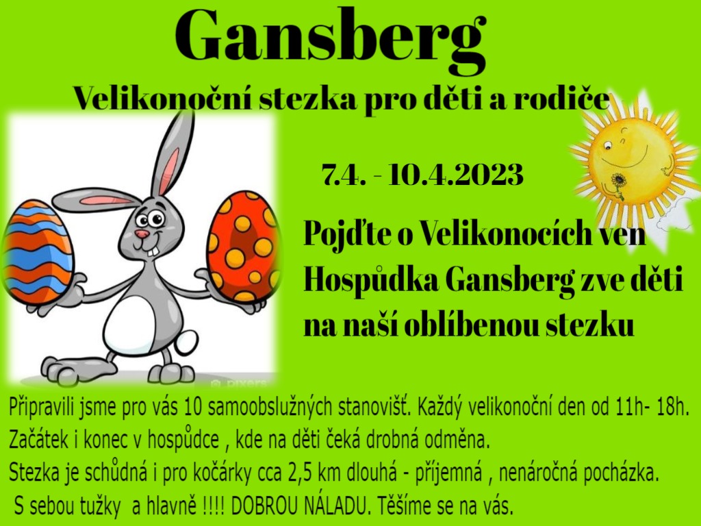 Dobrý den, rádi bychom poděkovali všem, kteří se účastnili Gansberské velikonoční stezky.Velice nás překvapila vaše velká účast. I přes chladné počasí byla návštěvnost úžasná. Právě toto je pro nás odměnou. Stezka byla tématicky zaměřená na velikonoce a dlouhá asi 3 km, dětičky ji hravě zvládly a dostaly zaslouženou odměnu .Velké poděkování patří Klárce Markové, která hodně povedenou stezku naplánovala a připravila a také firmě Komfi která nám přispěla z části Kinder vajíčky. MOC DĚKUJEME . Další akcí na Gansbergu bude - pálení čarodějnic ,které se bude konat 29.4.2022. Těšíme se na vás.
